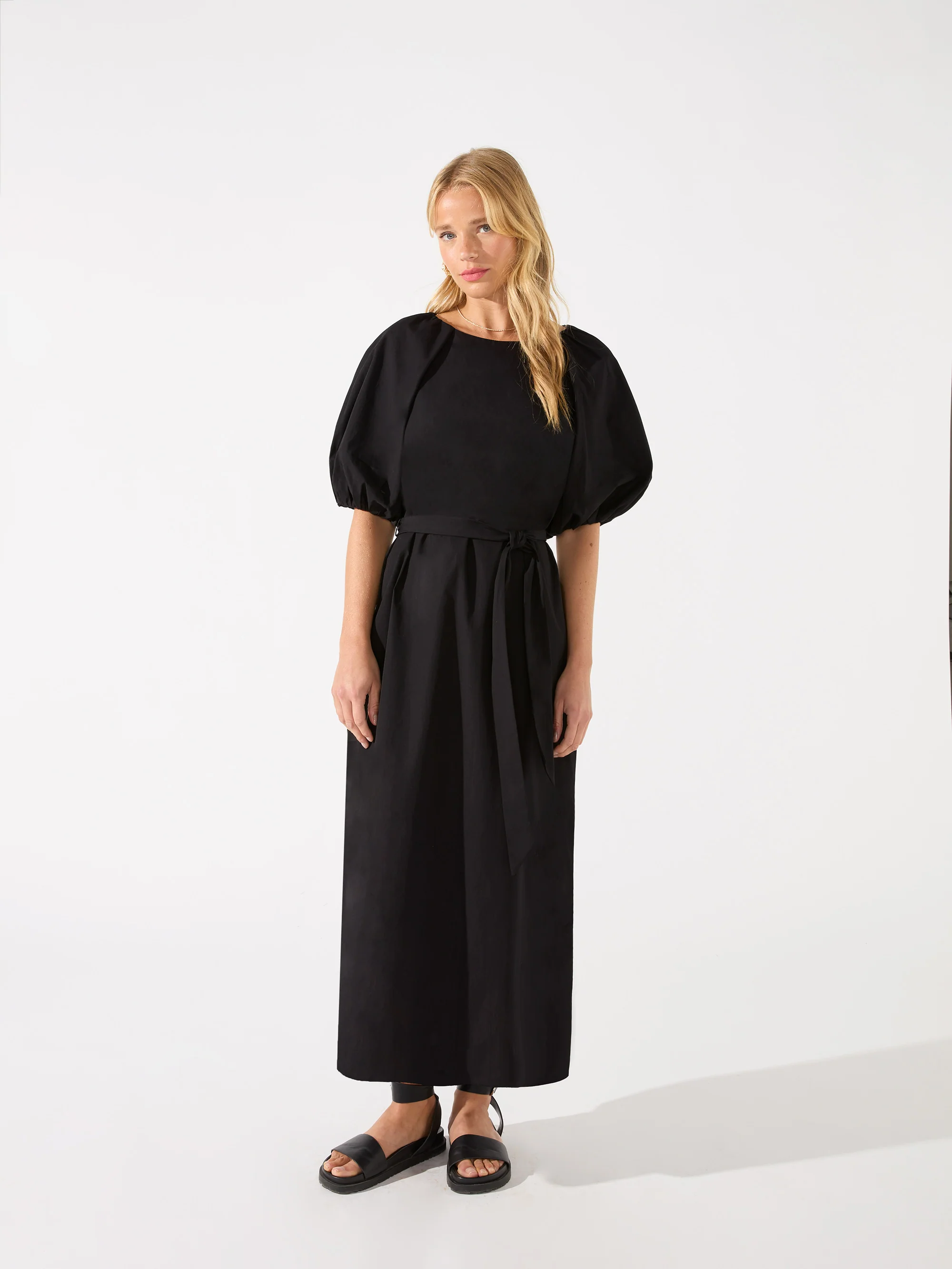 Black Puff Sleeve Tie Waist Sleeve Midi Dress