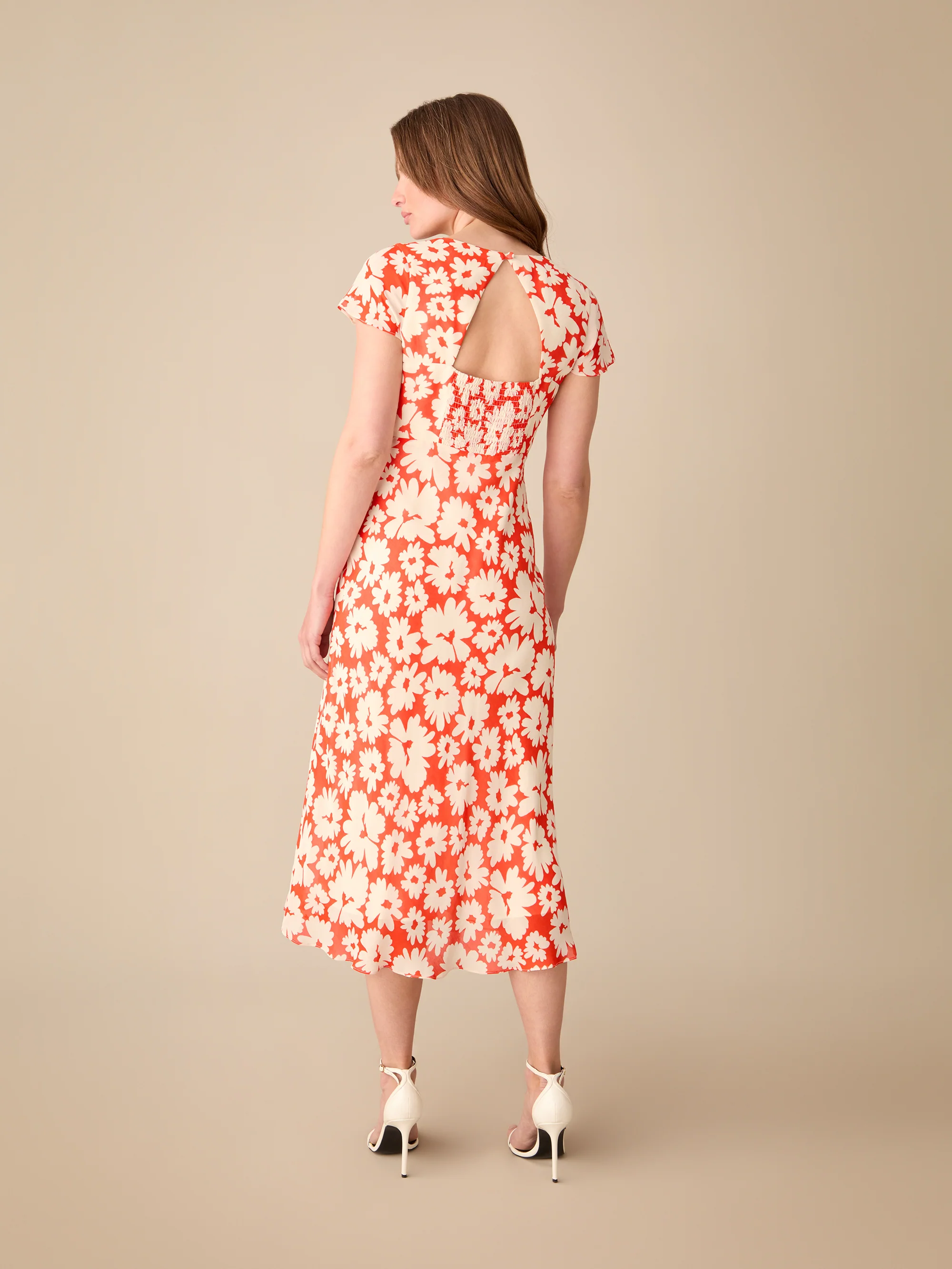 Red Daisy Print Sweetheart Neckline Midi Dress