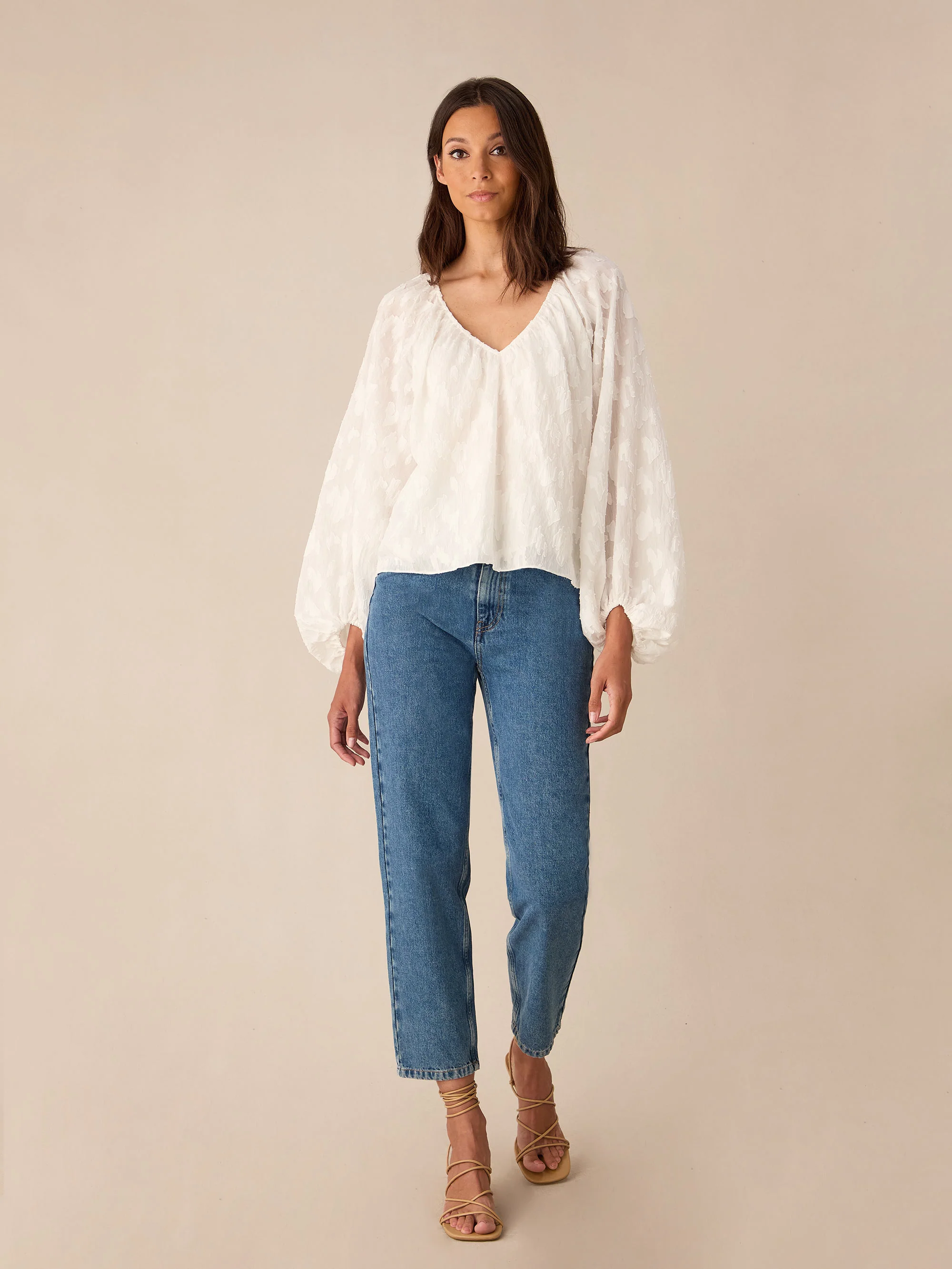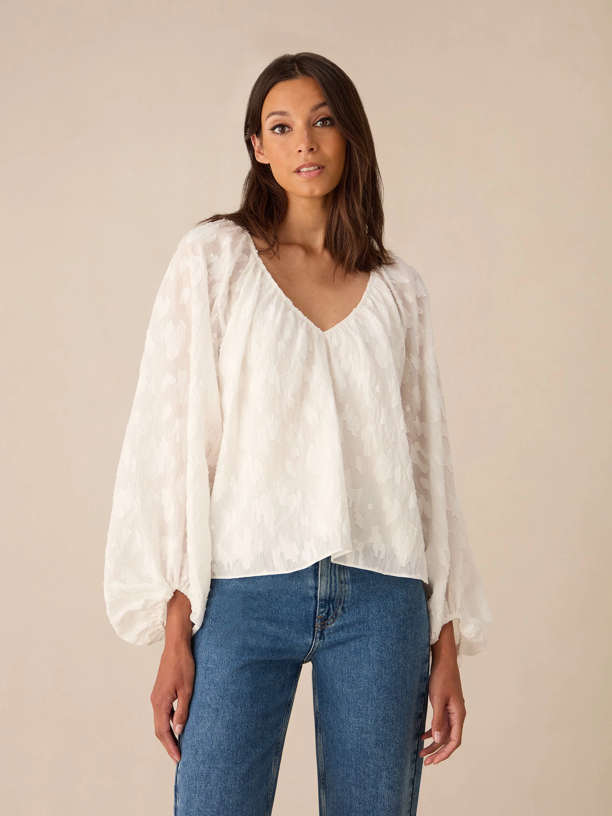 Ivory Leopard Jacquard Blouson Sleeve Blouse