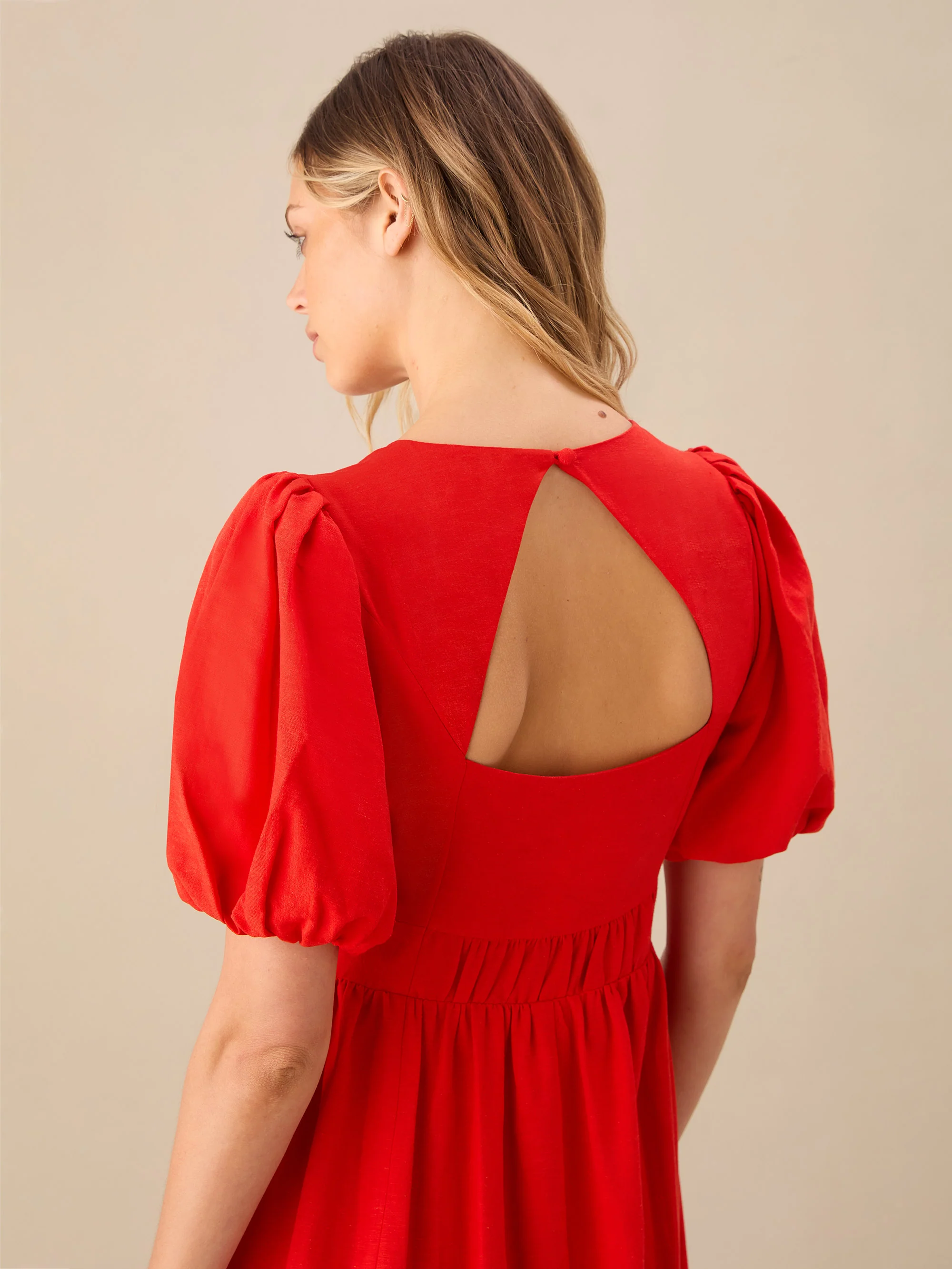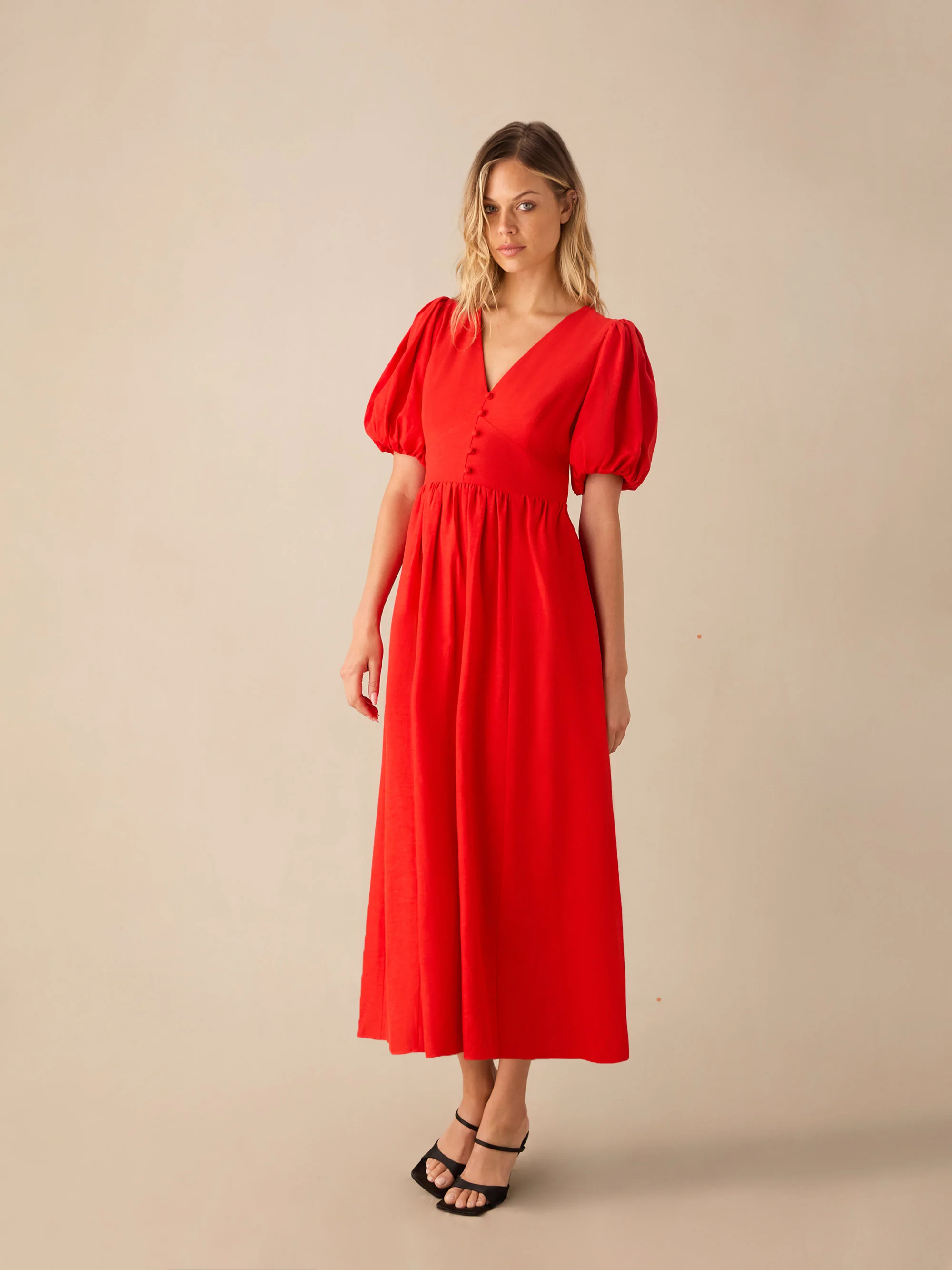 Cara Red Linen-blend Puff Sleeve V-Neck Midi Dress