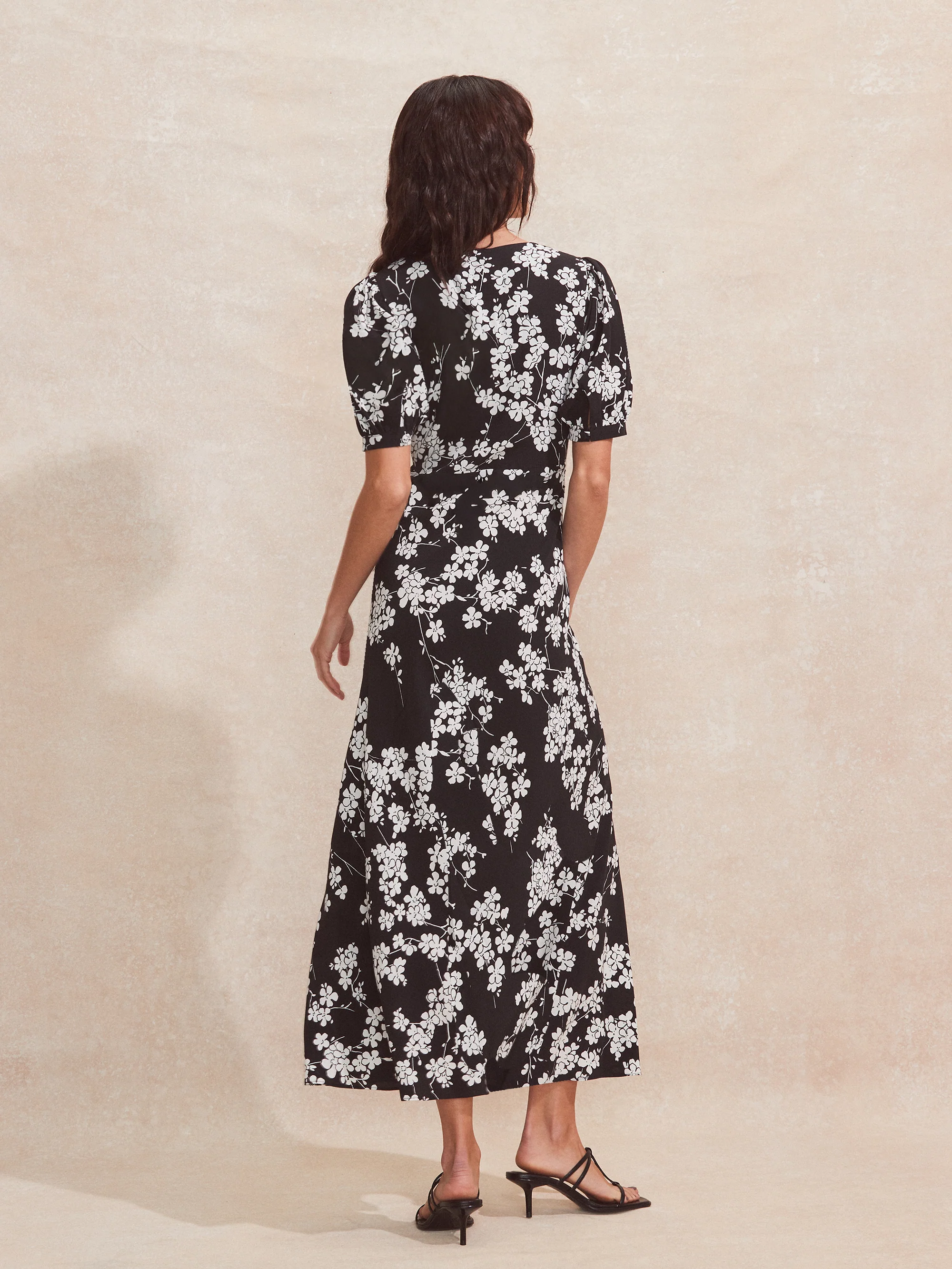 Seraphina Magenta Floral-Print Gathered-Sleeve Dress